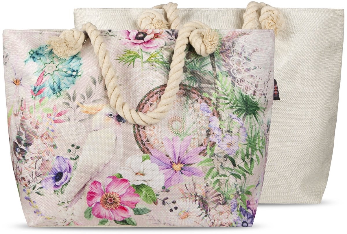 Deze strandtas is van de buitenkant gemaakt van 100% linnen, waardoor de tas een luxe uitstraling heeft. De strandtas heeft prachtige kleuren en is een ware blikvanger. De tas heeft een handige rits, waardoor de spullen er niet zomaar uit de tas zullen vallen.