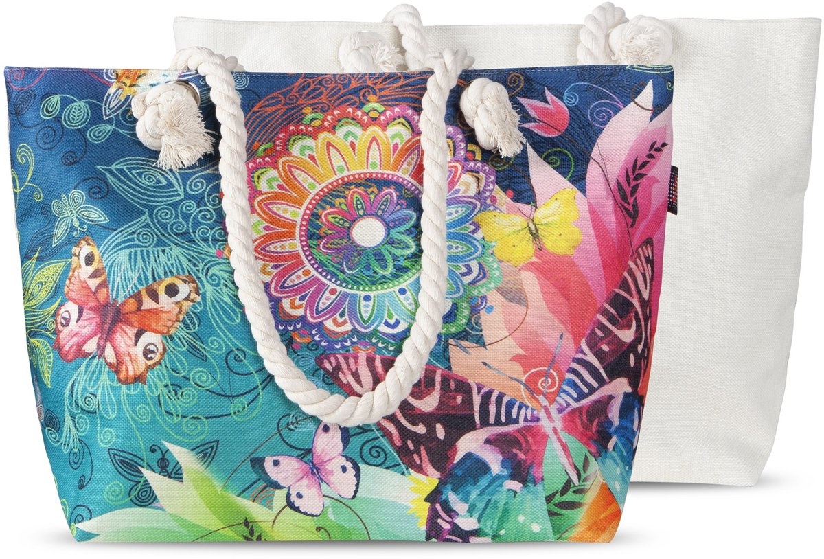 Deze strandtas is van de buitenkant gemaakt van 100% linnen, waardoor de tas een luxe uitstraling heeft. De strandtas heeft prachtige kleuren en is een ware blikvanger. De tas heeft een handige rits, waardoor de spullen er niet zomaar uit de tas zullen vallen.