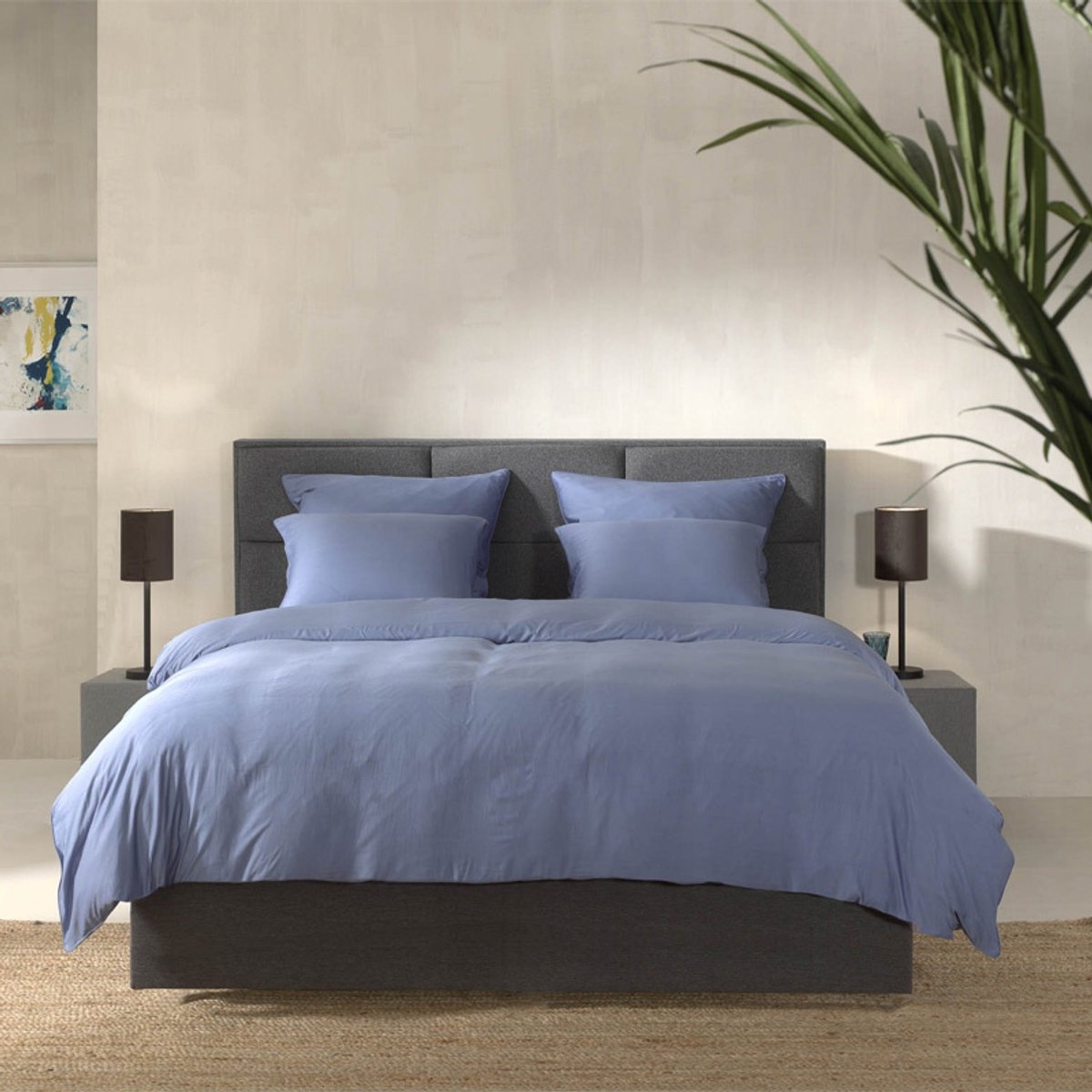 De blauwe kleur past goed binnen verschillende slaapkamerstijlen.