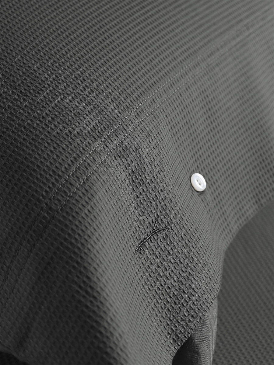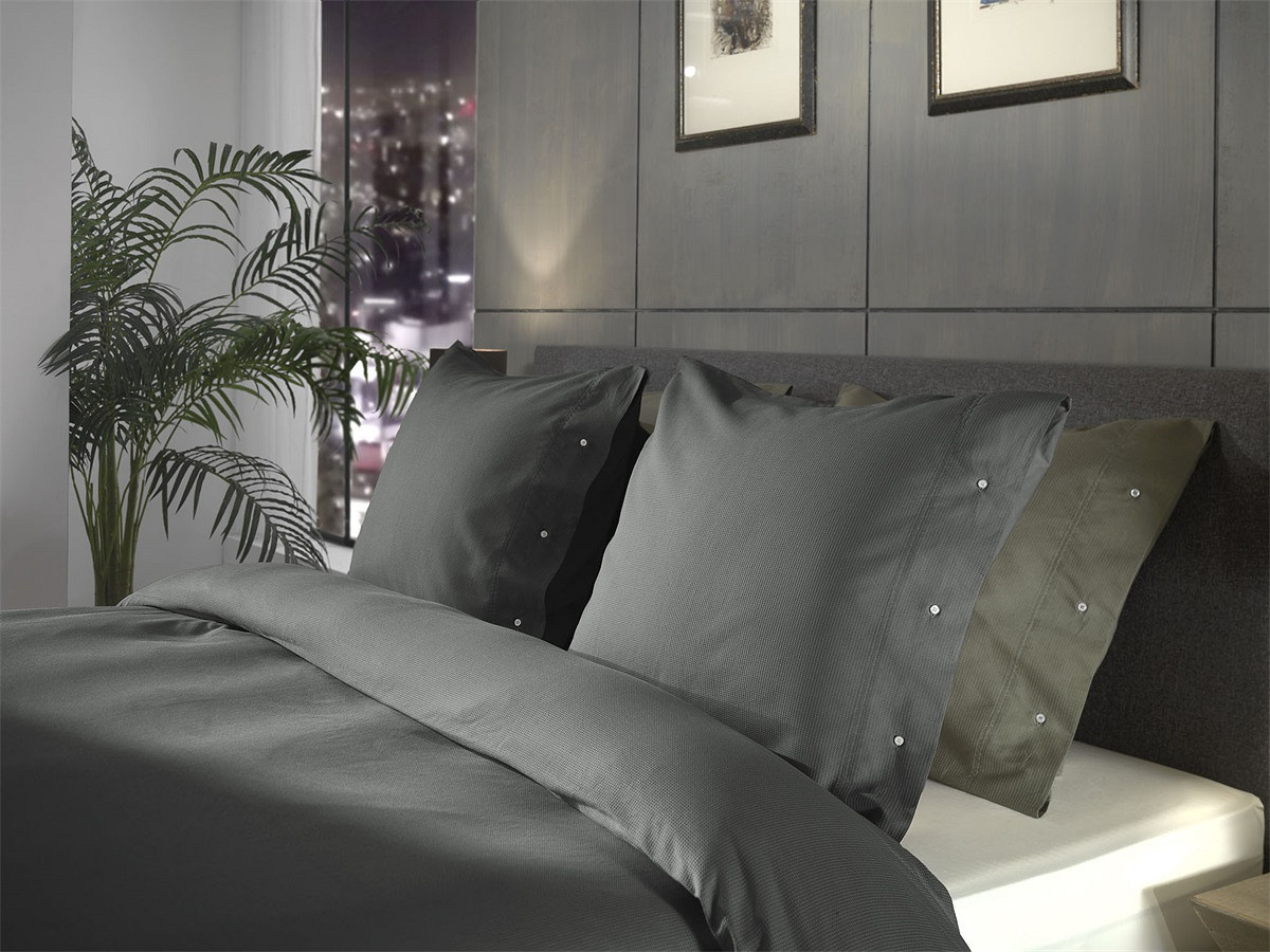 De diepe grijstint gecombineerd met de subtiele wafelstructuur zorgt voor een luxe en moderne uitstraling. De knoopdetails op de kussenslopen vormen een elegant accent.