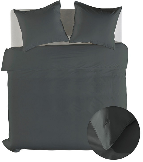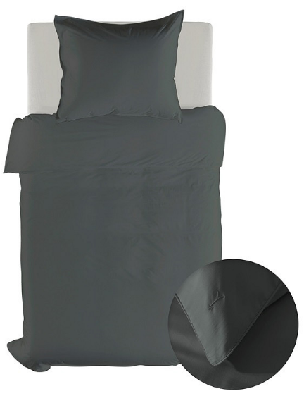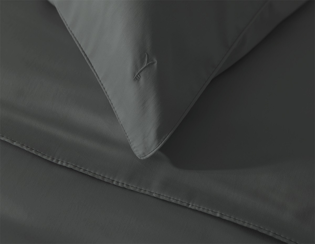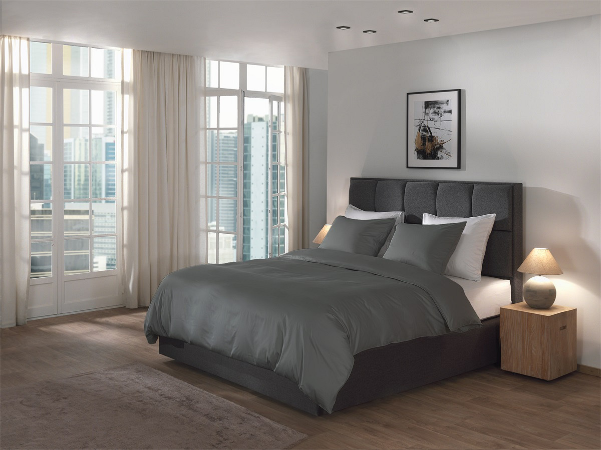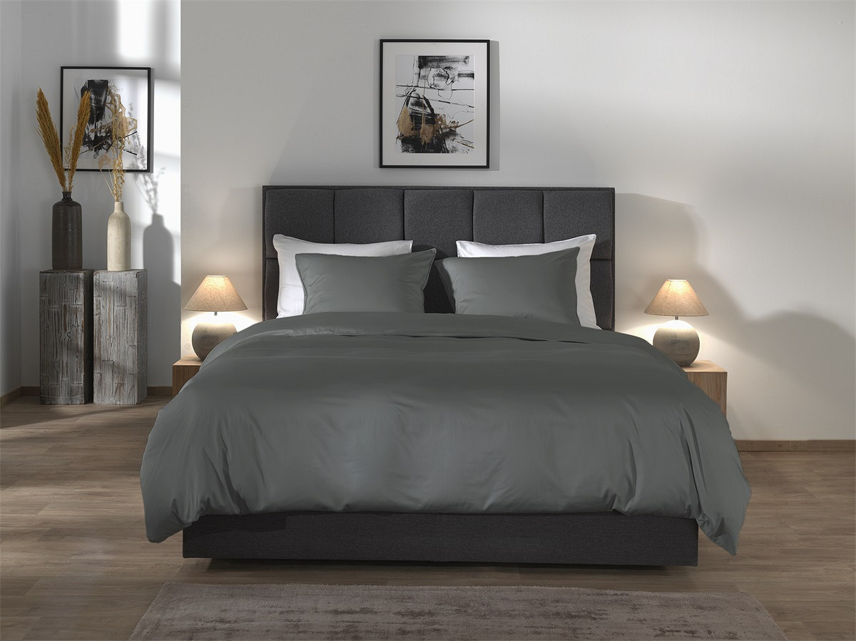De diepe antracietkleur zorgt voor een elegante en moderne sfeer in de slaapkamer. In combinatie met de subtiele glans van katoensatijn krijgt het bed een luxe hotelachtige uitstraling.