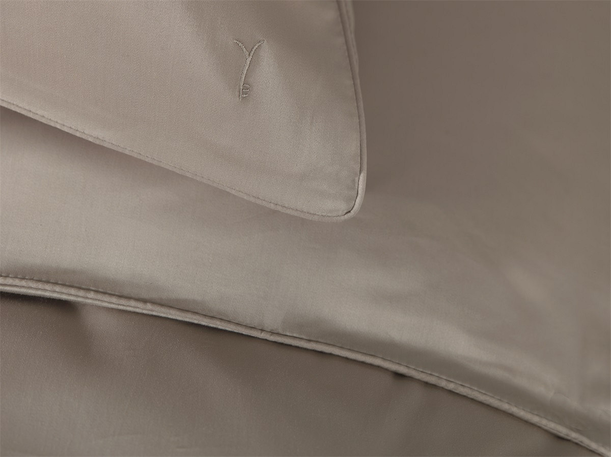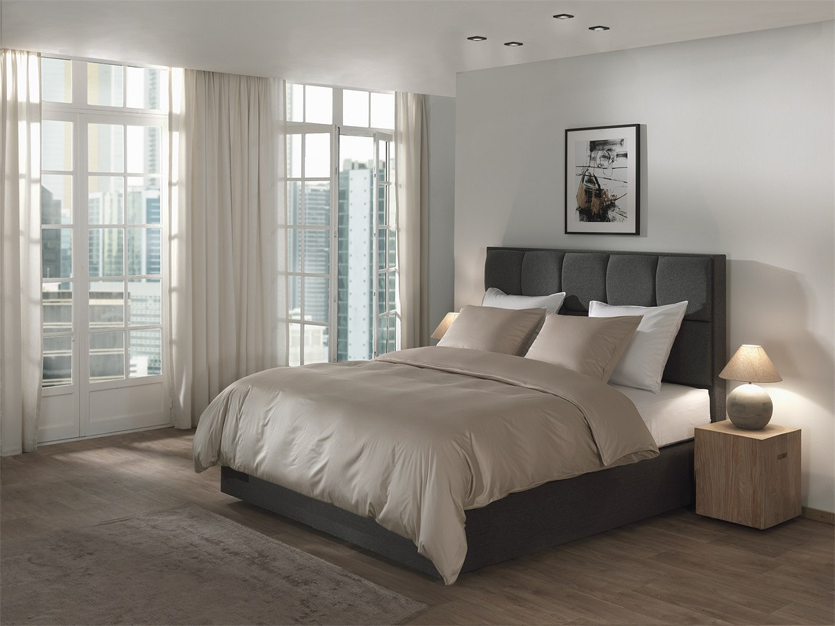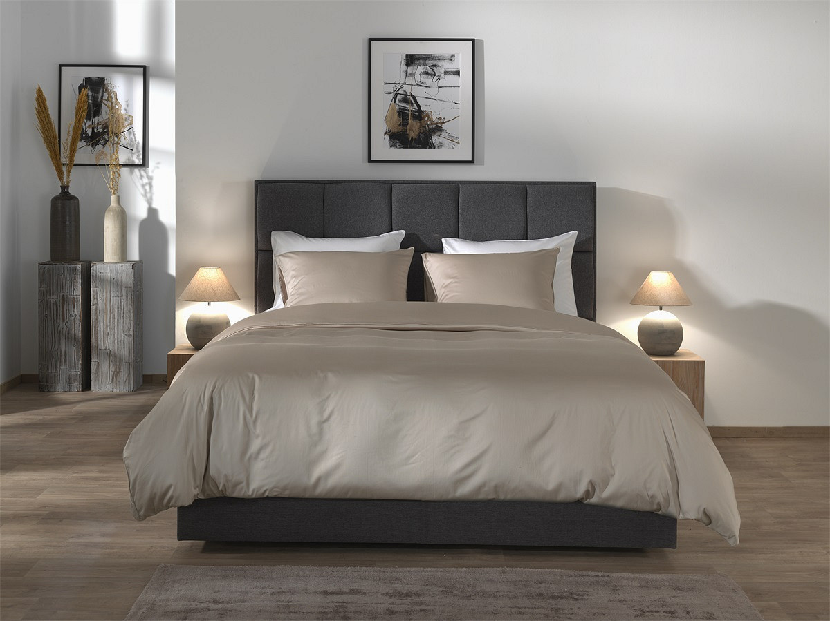De warme zandkleur creëert een rustige en elegante sfeer in de slaapkamer. De subtiele glans van katoensatijn versterkt deze luxe uitstraling.