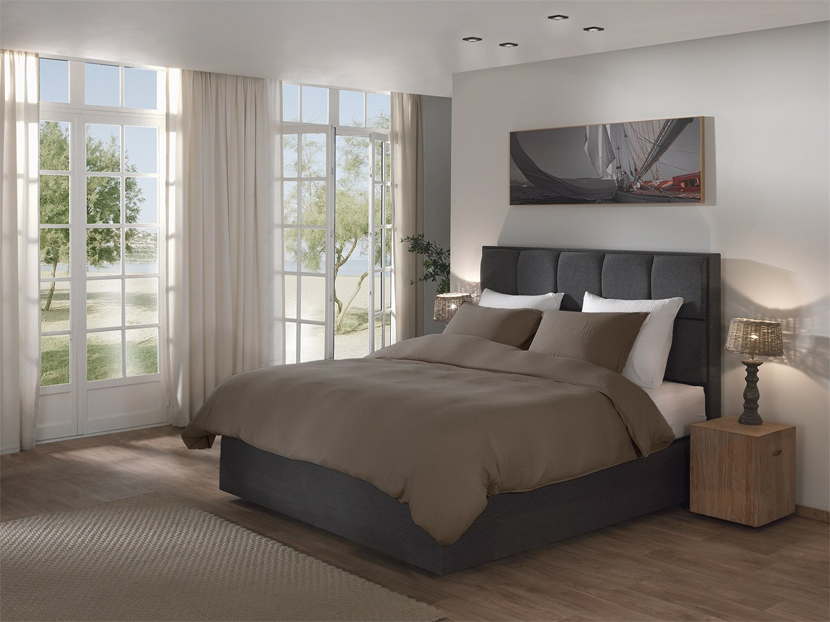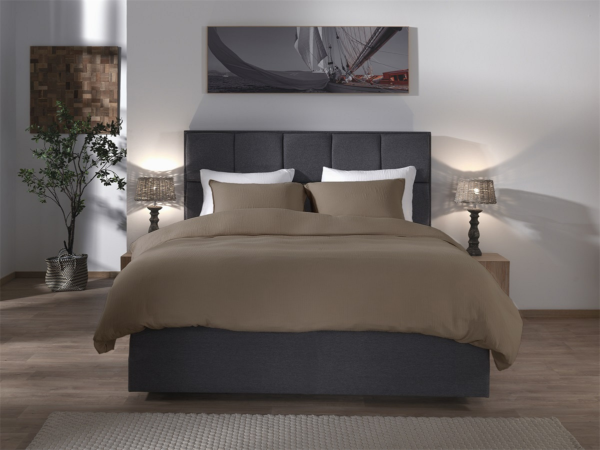 Door de neutrale taupetint combineert dit dekbedovertrek eenvoudig met verschillende kleuren en materialen, van natuurlijke tinten tot moderne interieurstijlen.