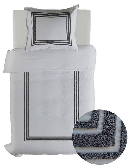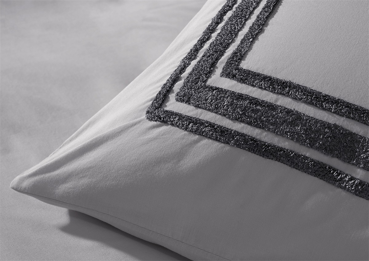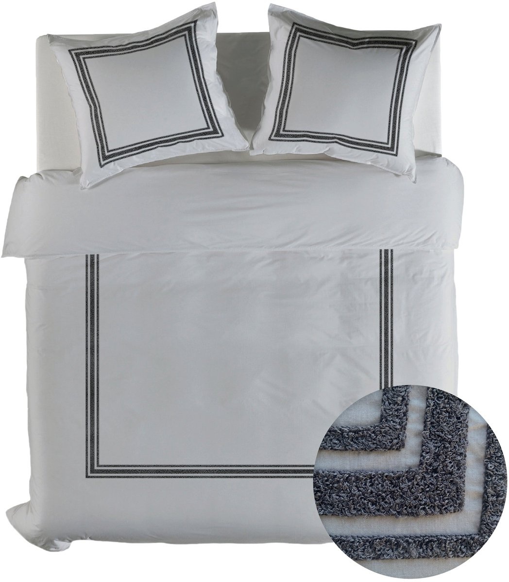 Het ingeweven badstofkader rondom het dekbedovertrek en de kussenslopen geeft dit grijs dekbedovertrek een uniek karakter. Dit detail zorgt voor een subtiele structuur en een luxe uitstraling.