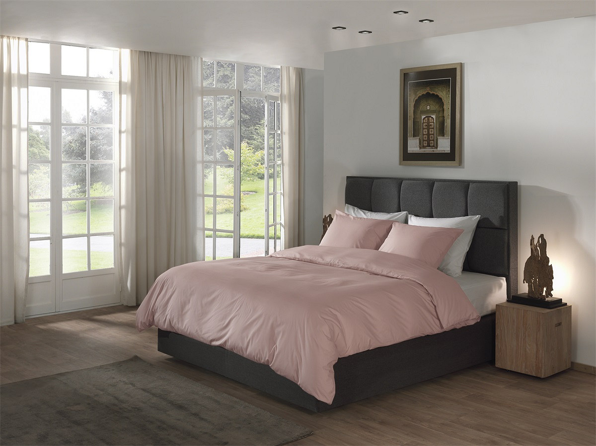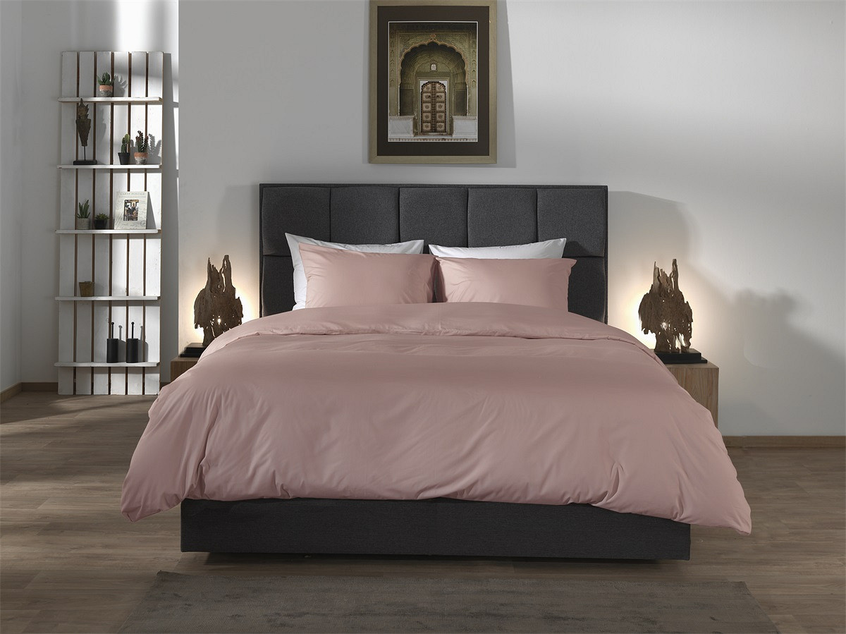 De zachte roze kleur geeft het bed een elegante en rustige uitstraling en creëert een sfeervolle slaapkamer.