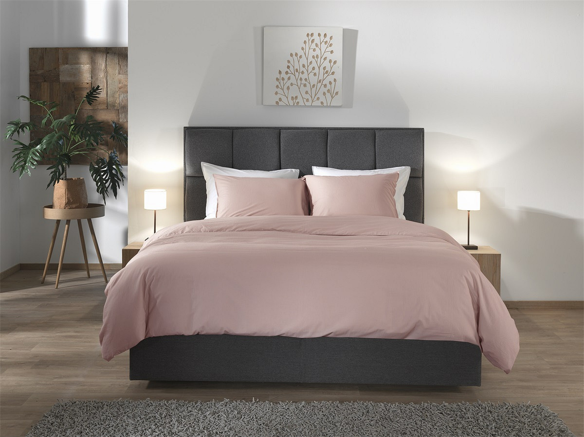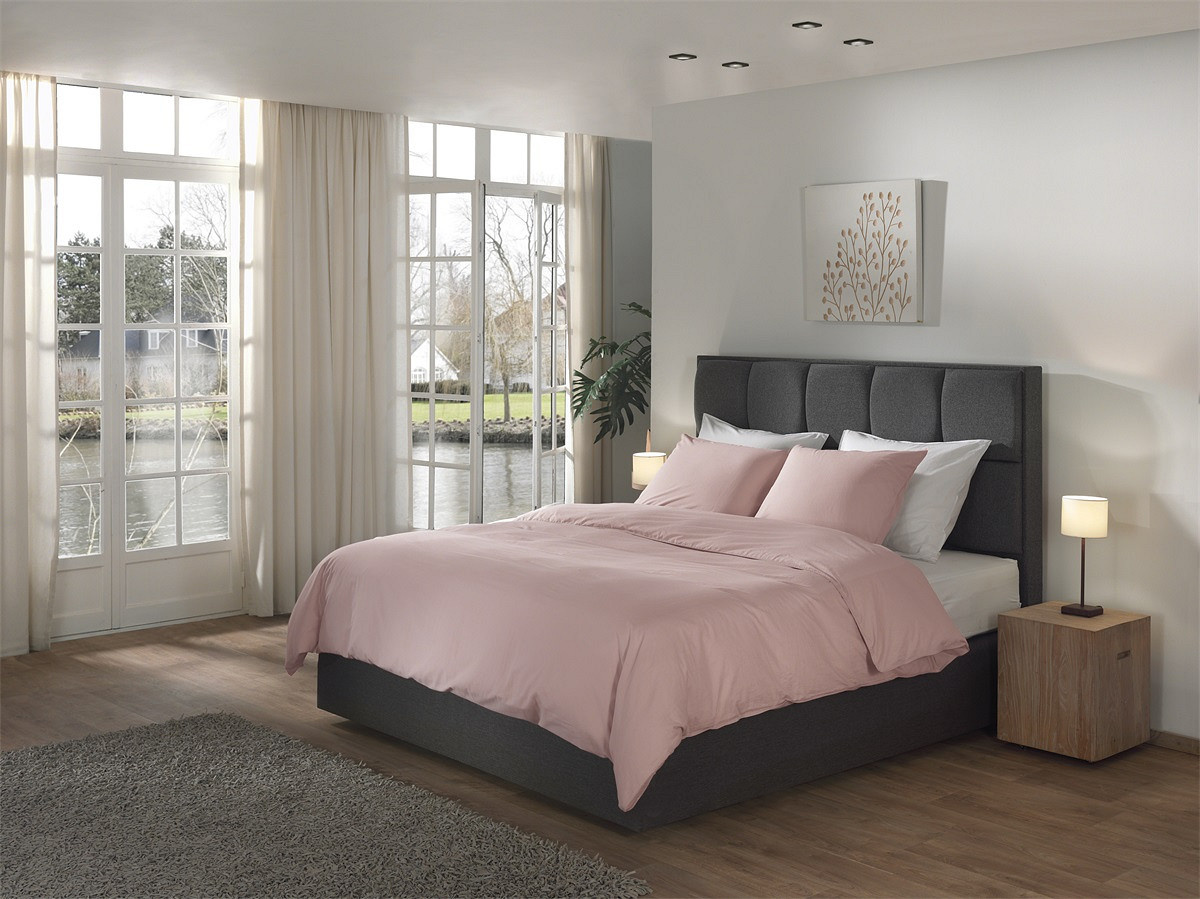 De zachte roze kleur geeft het bed een elegante en rustige uitstraling. Dit roze dekbedovertrek creëert een warme en sfeervolle slaapkamer.