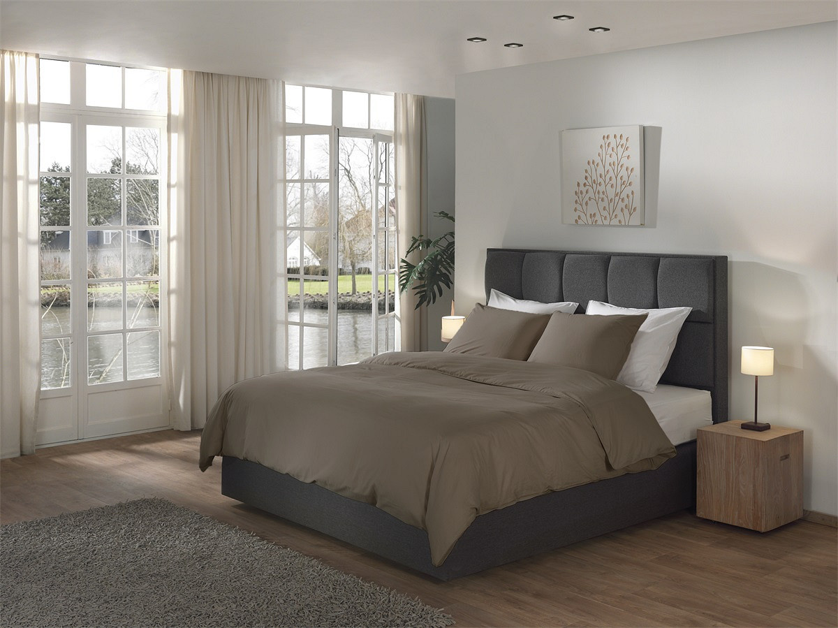 De warme taupekleur geeft het bed een elegante en rustige uitstraling. Dit taupe dekbedovertrek zorgt voor een sfeervolle en stijlvolle slaapkamer.