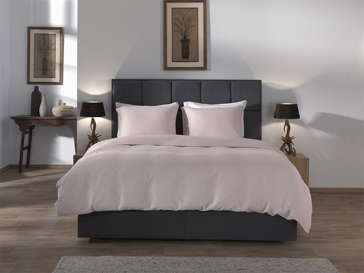 De zachte roze kleur geeft het bed een elegante en warme uitstraling. Dit effen dekbedovertrek zorgt voor een rustige en stijlvolle sfeer in de slaapkamer.