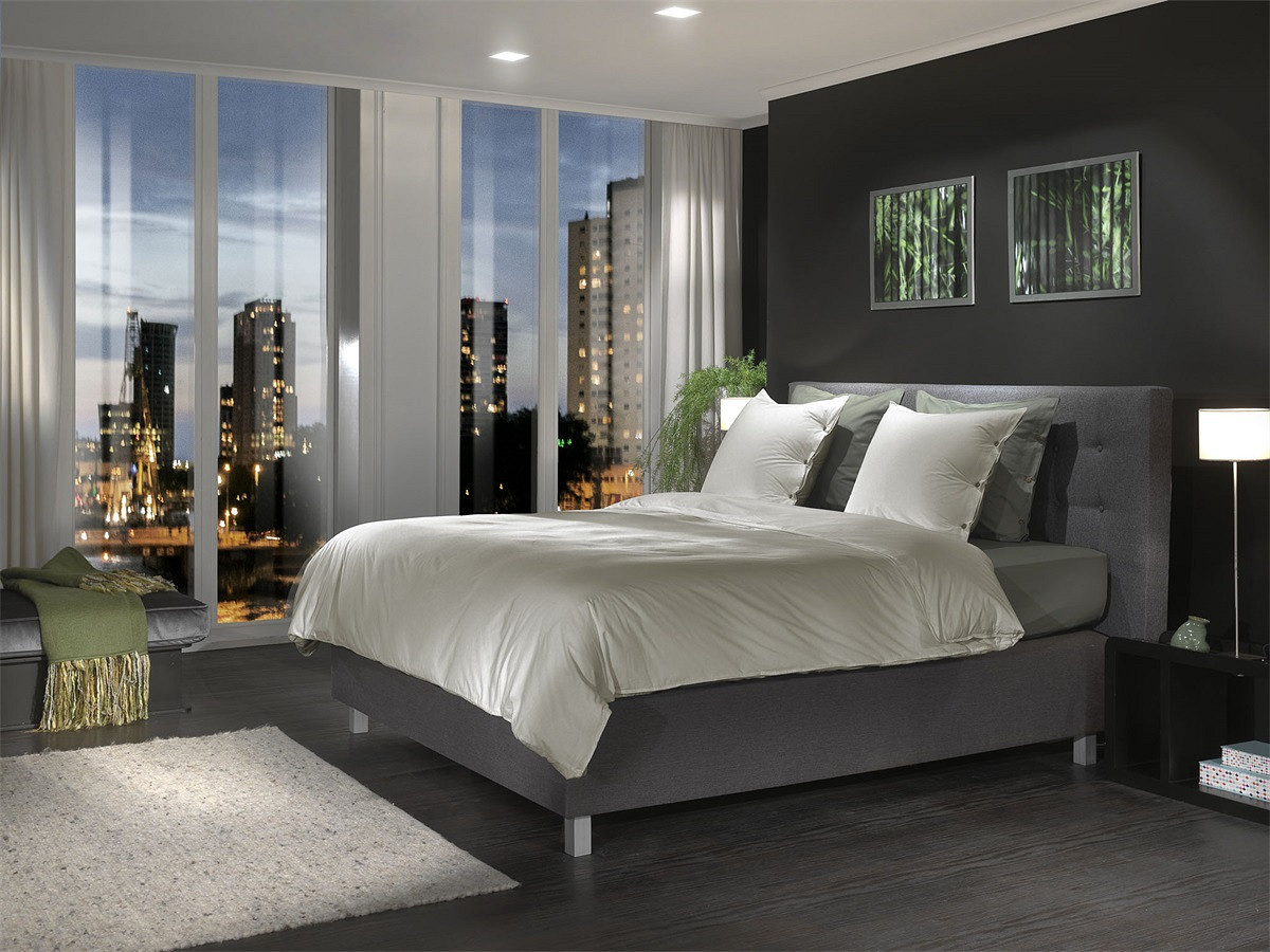 De elegante grijstint zorgt voor een moderne en rustige uitstraling in de slaapkamer.