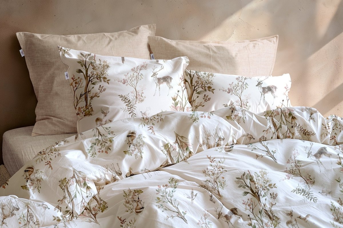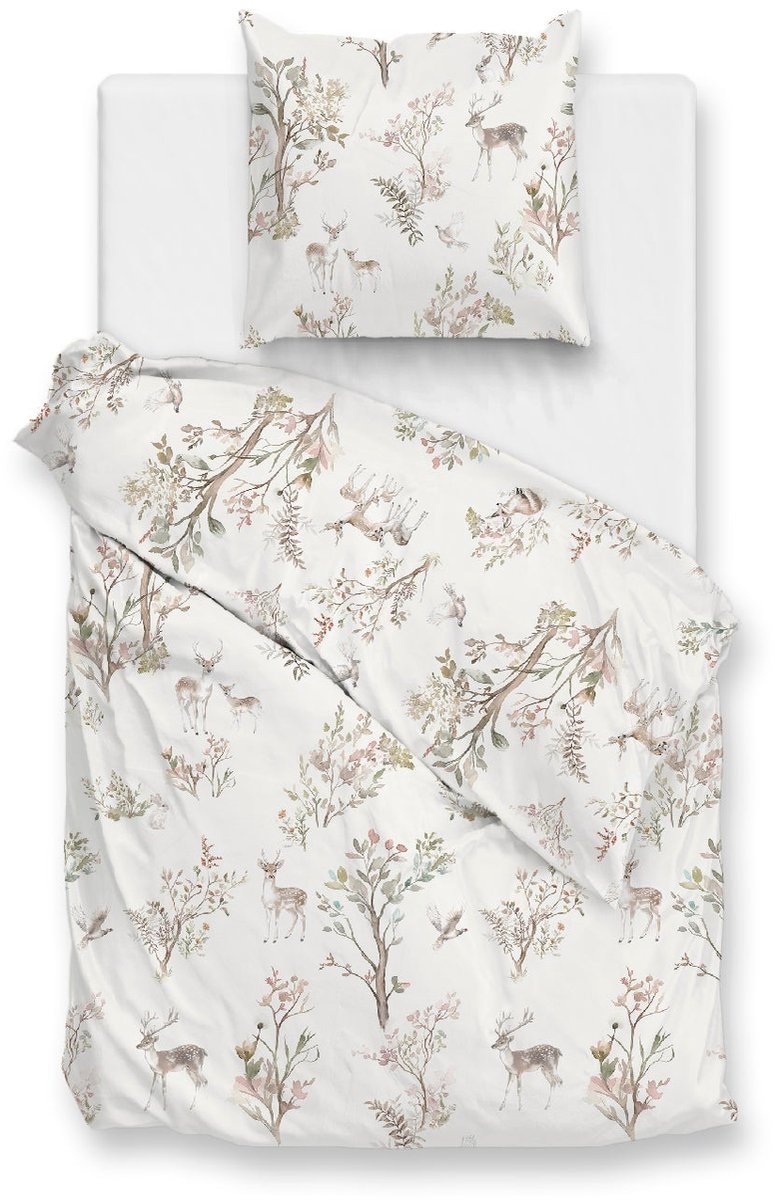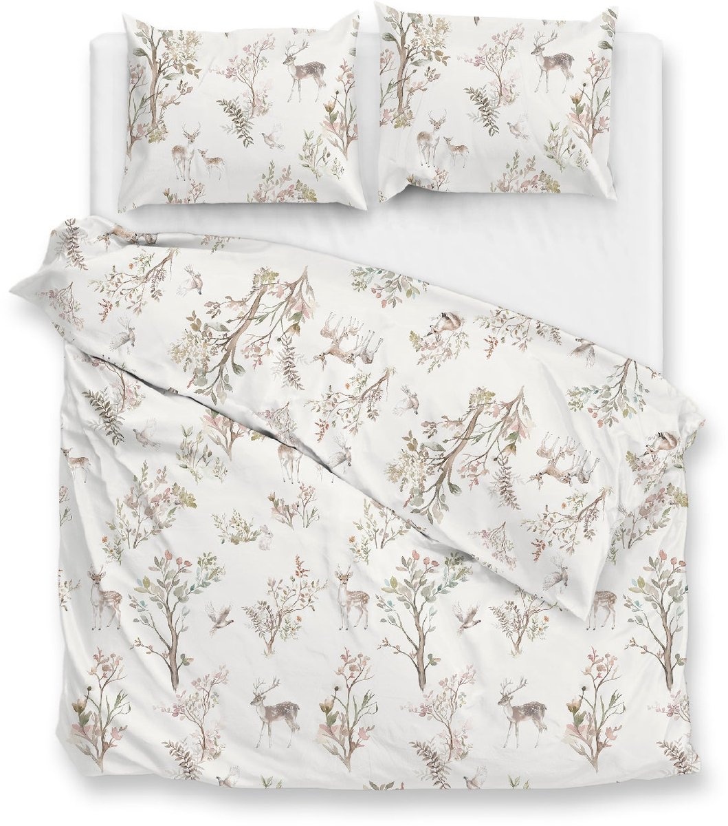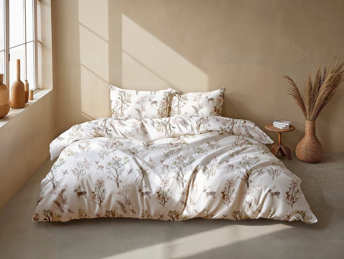 Het bosachtige dessin met hertjes, takken en bladeren geeft het dekbedovertrek een sfeervolle en natuurlijke uitstraling die rust brengt in de slaapkamer.