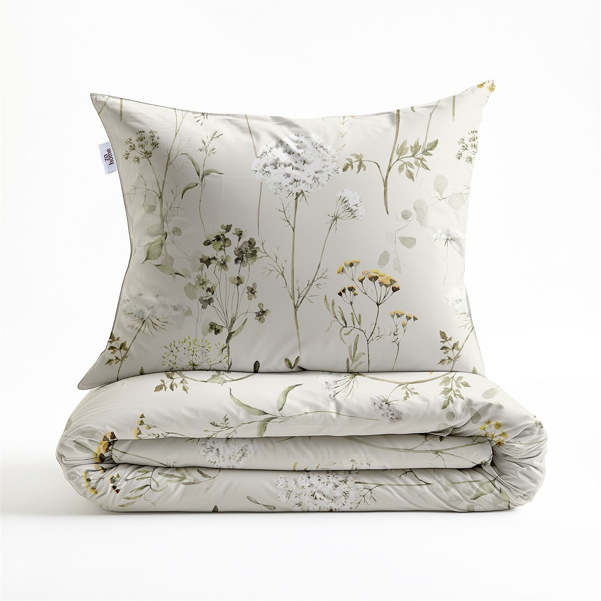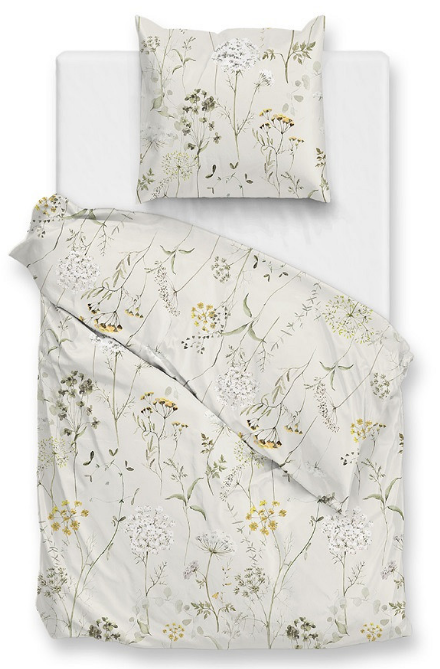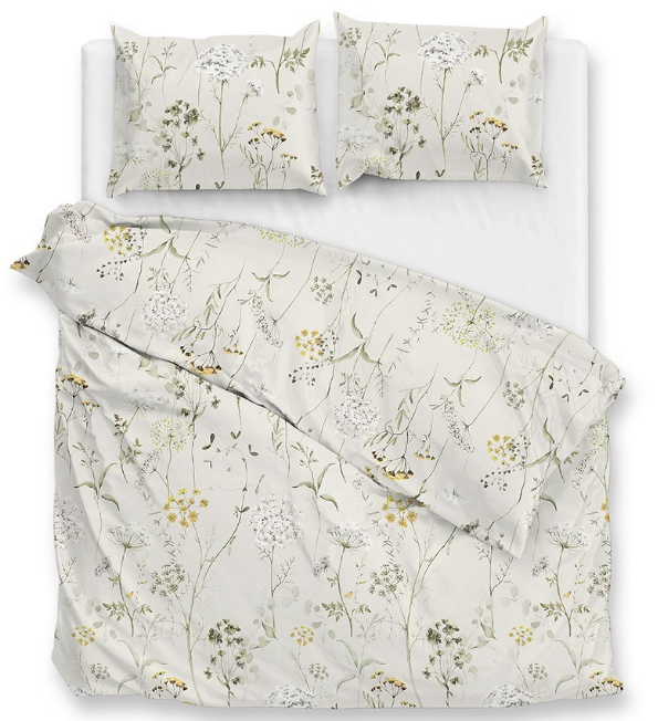 Dit sierlijke dekbedovertrek toont een verfijnd patroon van veldbloemen en botanische takjes in zachte beige-, geel- en groentinten op een lichte ondergrond. Het luchtige bloemenmotief geeft de slaapkamer een frisse, romantische en natuurlijke uitstraling. Als elegant bloemen dekbedovertrek zorgt dit ontwerp voor een zachte en sfeervolle ambiance.